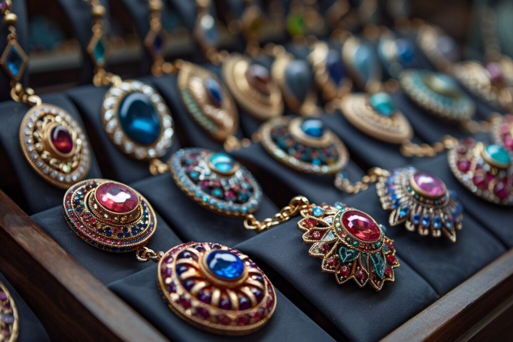 Parcourez des images de bijoux traditionnels arabes pour trouver l’inspiration. Notez les motifs géométriques complexes, les pendentifs en forme de lune, et l’utilisation fréquente de couleurs vives comme le rouge, le bleu et l’or.
